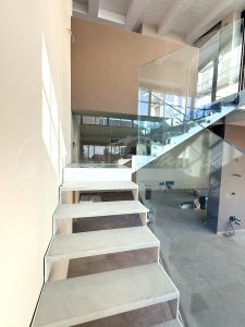 Piano Terra: Un scenografico salone open space con cucina a vista accoglie gli ospiti in un ambiente arioso e raffinato. Elemento architettonico distintivo è l'elegante scala in vetro, che dona leggerezza e carattere moderno alla zona giorno. Completa il piano un comodo ripostiglio/zona lavanderia e il primo servizio.